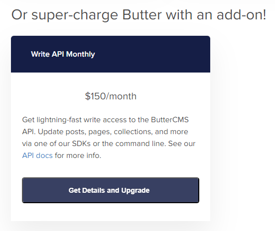 Write API is available as a paid add-on. To enable it:- Navigate to Settings > Billing in your ButterCMS dashboard