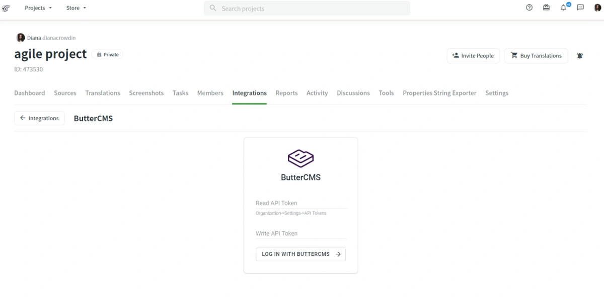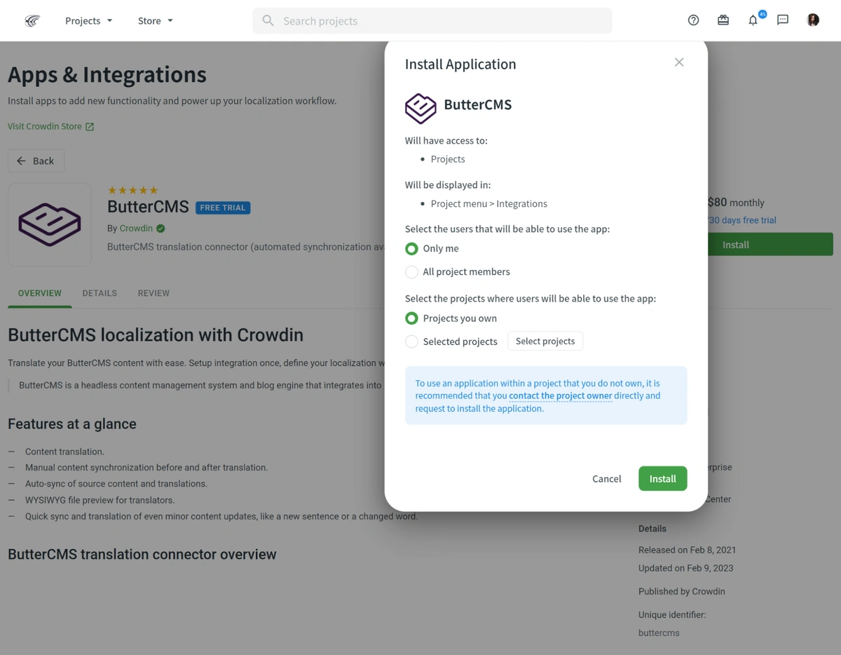 - Navigate to the ButterCMS page on the Crowdin Store