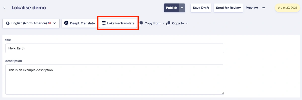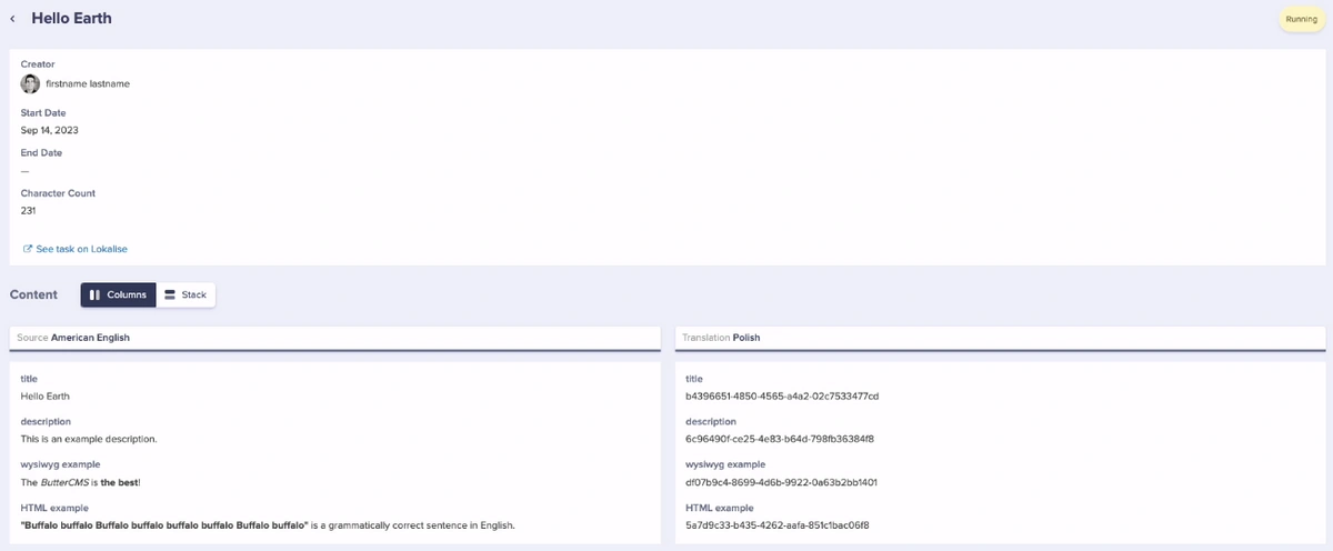 Once Lokalise has been enabled, you can initiate translation requests from pages or collections:Each site within a multi-site account must use a separate Lokalise project. ButterCMS webhooks are not designed to send organization IDs, so the same
