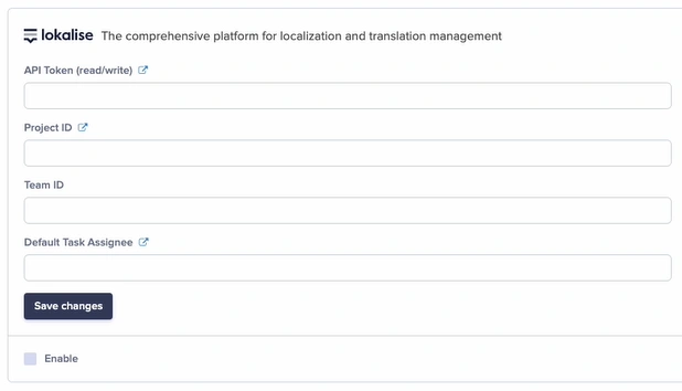 To enable the Lokalise integration, go to Settings > Integrations and fill out the following fields:-