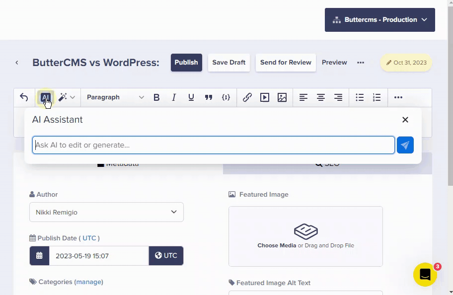 Use the AI Assistant button when you want to create new content from scratch. Simply describe what you need, and the AI will generate it for you.AI shortcuts: Transform existing content