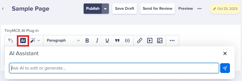 The AI integration provides two main toolbar buttons:AI Assistant: Generate new content