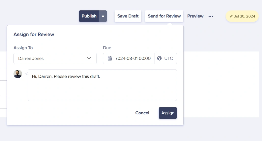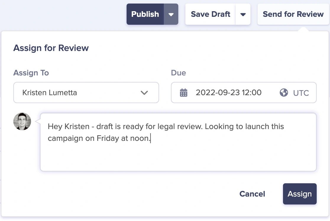 A workflow is kicked off when you assign draft content for review to someone in your organization.- Save your content as a draft