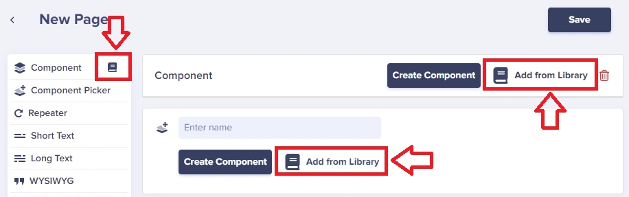 Select Components from your Component Library by simply clicking the Add from Library button or the Library shortcut icon:Viewing all Components