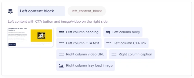 Components are a special field type you can add to Page schemas. A Component allows you to logically group related content fields to make it easy for content editors to build new unique pages. They’re the building blocks that let you mix and match different types of content sections.Key features