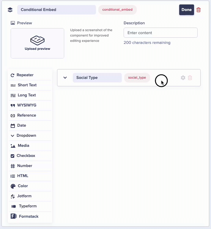 Conditional fields in a Component are shown only when a trigger field, such as a checkbox or dropdown, has been activated.
