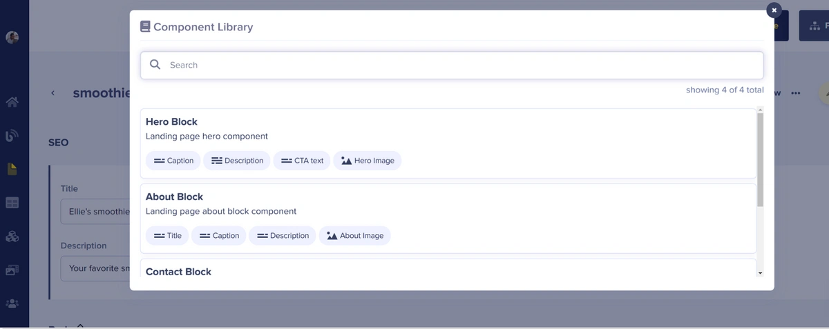 This opens a Component Library modal of Components that have been filtered to those in the Picker’s allowlist.
