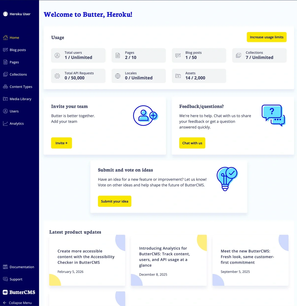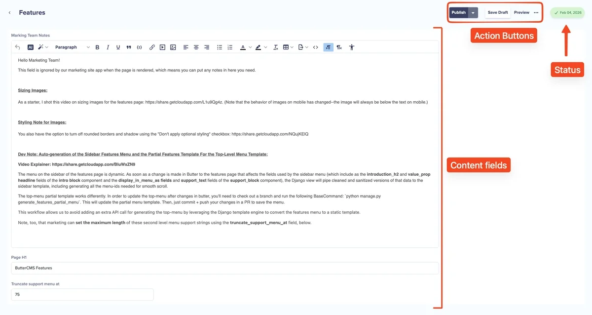 ButterCMS’s intuitive interface makes it easy to add content, save drafts, schedule publishing, check status, and more.- Content fields - All the fields defined for that content type