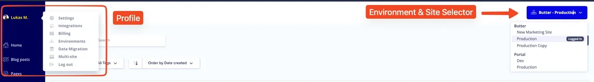 | Environment & site selector | Switch between different environments (e.g., Production, Staging) and sites if you have multi-site enabled |