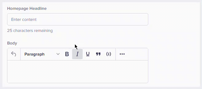 The Required checkbox lets you mark a content field as required, so it cannot be left blank. This ensures content editors provide all necessary information before saving.When a field is marked as required:- The field displays a visual indicator (typically an asterisk *)