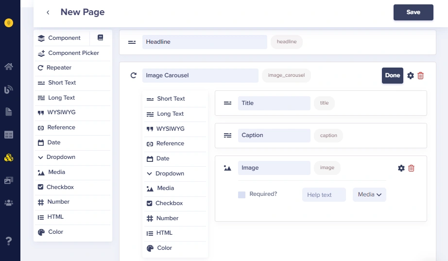 Add the fields that will be repeated for each item. For an image carousel example, add: