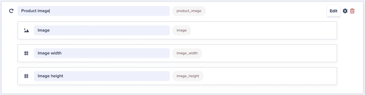 In a Product Detail Page Type, you can define Product Image as a field that uses a Repeater. The field has three subsequent fields nested within it — a media field and two number fields for width and height dimensions.Feature lists