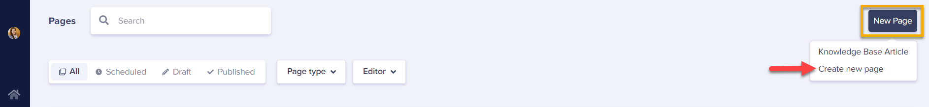 First, go to your Pages dashboard, click the New Page button and a drop-down menu will appear. Choose Create new page.