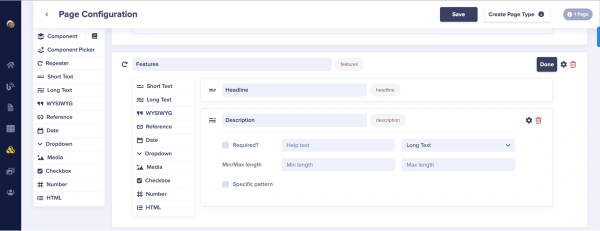To create a features section, use a Repeater field. With a Repeater, you can create a list containing a set of identical objects. For a features section, add the following fields to the Repeater:- Short Text named “Headline”