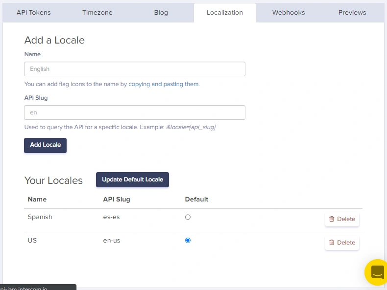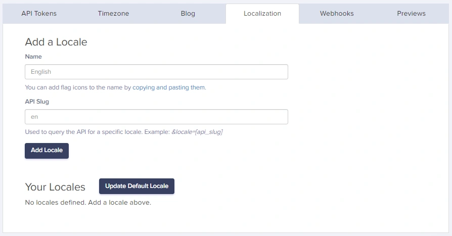 To set up Localization in your ButterCMS account, navigate to Settings > Localization and enter the name and slug for all the Locales you want to set up:Adding a new locale