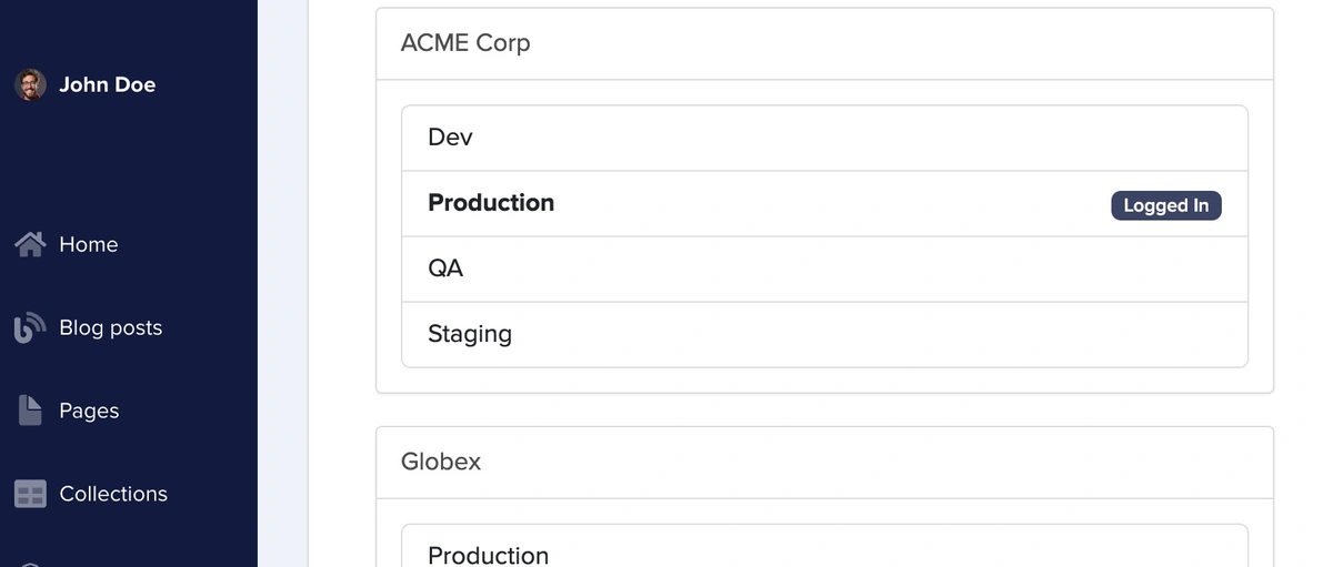 Once logged into ButterCMS, here are two main ways to switch between environments and sites: