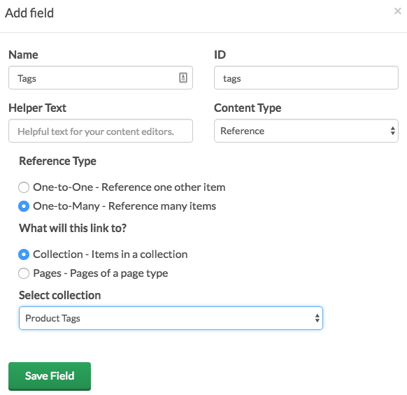 In order to create article pages, you must first categorize your pages using the collection feature. This allows you to use collections as filterable properties for your pages.Product Tags collection: